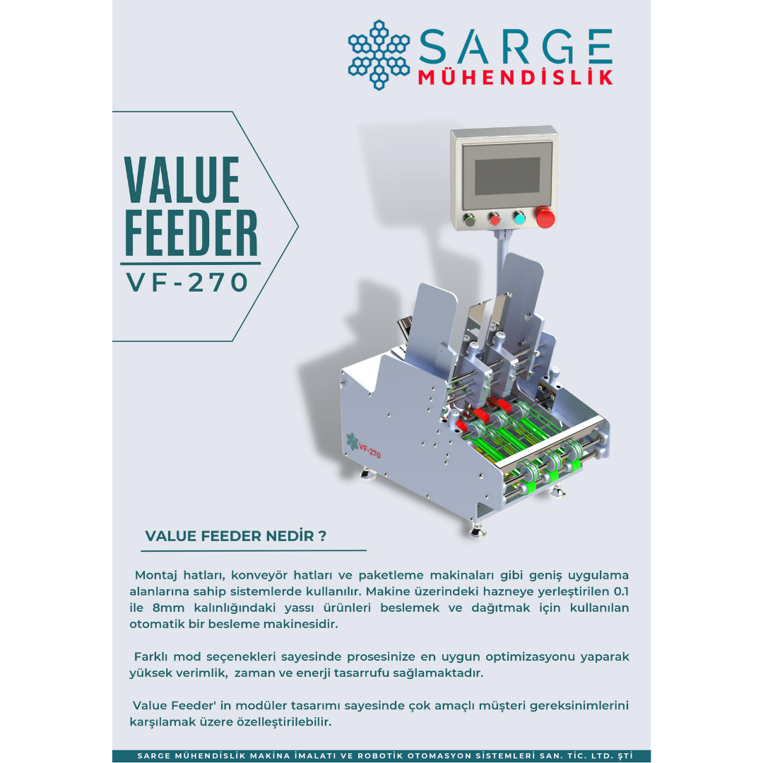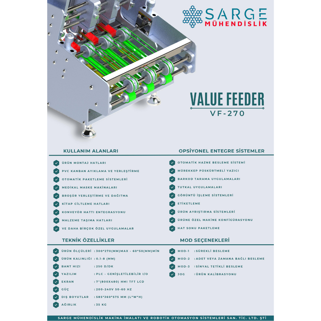 Montaj hatları, konveyör sistemleri ve paketleme makineleri gibi geniş uygulama alanlarında kullanılmak üzere tasarlanmıştır. Makine üzerindeki hazneye yerleştirilen 0.1 mm ile 8 mm arasındaki yassı ürünleri otomatik olarak besler ve dağıtır.